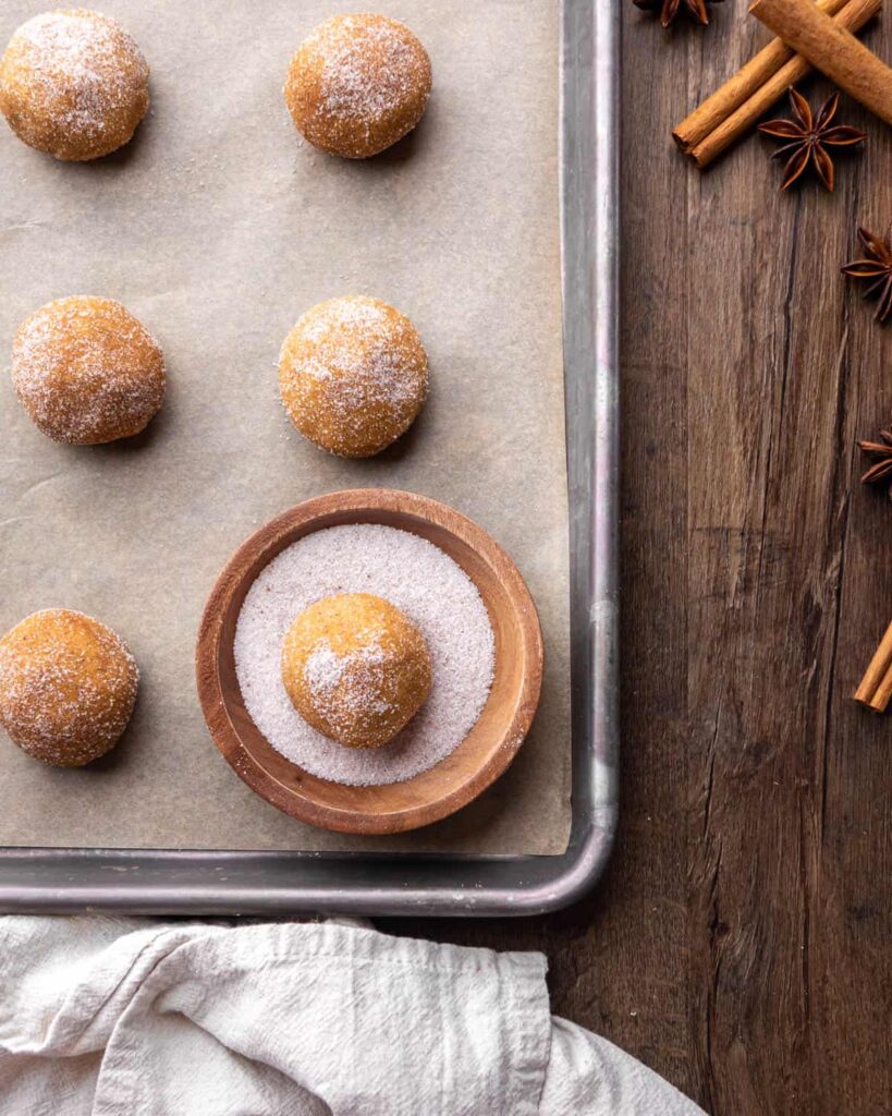 - Scoop the dough with a 2 tbsp cookie scoop, and roll them into balls. Then roll the dough balls in the spiced sugar. (If the dough is too “sticky”, chill it in the fridge for 10 minutes, then proceed.)