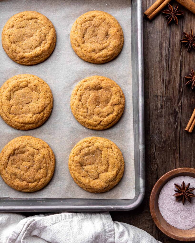 - Scoop the dough with a 2 tbsp cookie scoop, and roll them into balls. Then roll the dough balls in the spiced sugar. (If the dough is too “sticky”, chill it in the fridge for 10 minutes, then proceed.)